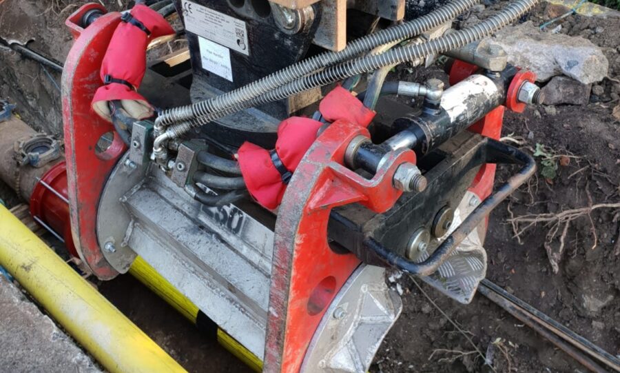 Live Mains Insertion is similar to normal insertion of polyethylene pipe (PE) into an old cast iron main with one important difference. By using a special gland box and a live head on the PE, the old main is kept live throughout the insertion process and the new PE is gassed up to maintain supplies to customers.