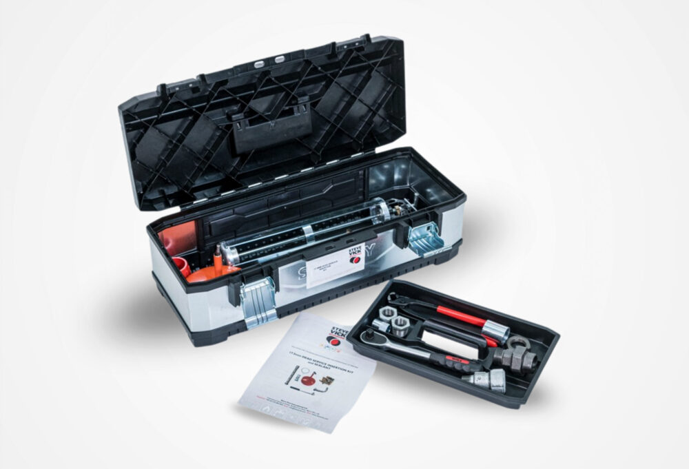 The kit includes an 8.4m length of 17.5mm PE pipe with formed dome which seals the pipe in the pipe and wire hoop for removal after insertion. Using the SVI hand pushing machine, the PE pipe is carefully inserted and guided with a tensioner and cable to avoid undue stress. The final connection is made using a bespoke draw-lock service head adaptor, and SVI’s specially formulated 17.5mm FULLSEAL™ sealant is injected to fill the annular space between the PE pipe and the existing service.